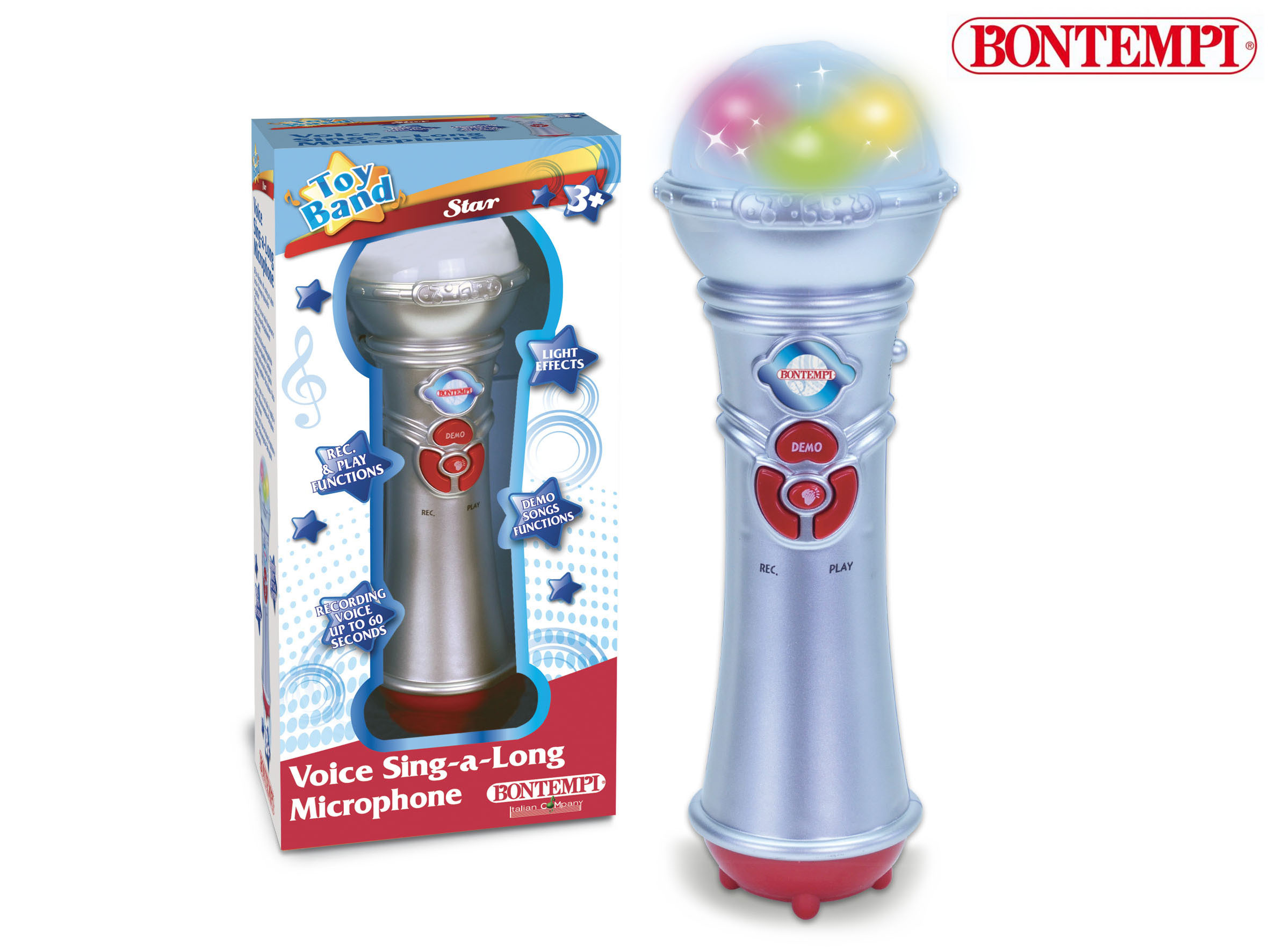 Hlasový mikrofon s funkcí nahrávání a přehrávání ? 4 demosongy ? Potleskové efekty ? Světelné efekty ? Napájení: 3 baterie R 03 / AAA 1,5 V (nejsou součástí balení) ? Rozměr: 72x72x210 mm číst celé