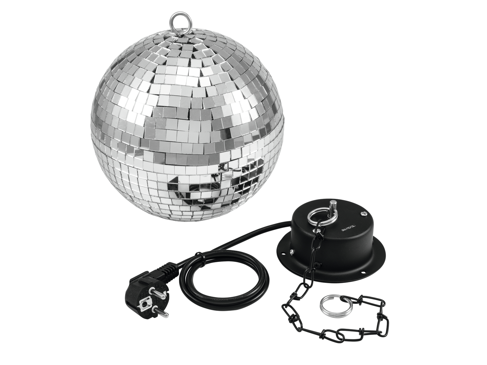 Sady obsahují zrcadlovou kouli v různých průměrech, motorek 1,5 otáčky/min. řetěz k upevnění koule. Ideální dekorace pro noční kluby, bary a restaurace.
