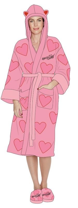 Oficiální výrobek - dámský župan z katalogu oblečení a módních doplňků s licencí fiktivní komiksové postavy Harley Quinn od vydavatelství DC Comics.