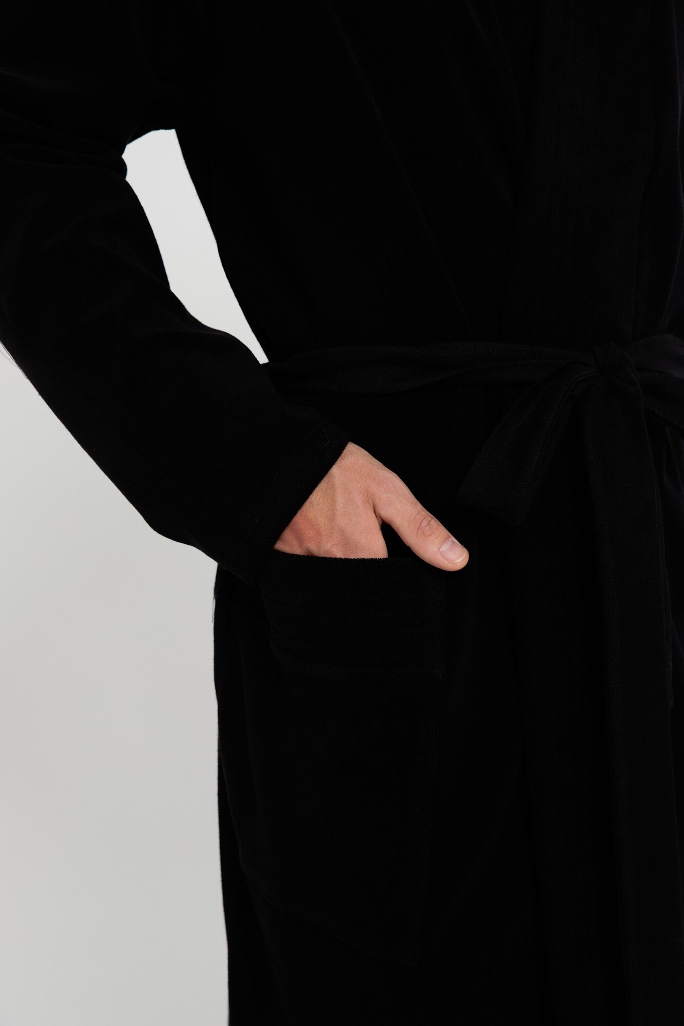 Klasyczny szlafrok męski- miękka bawełna- szalowy kołnierz- wiązany w pasie- na biodrach naszyte kieszenie- długość za kolanoSkład: 100% bawełna číst celé