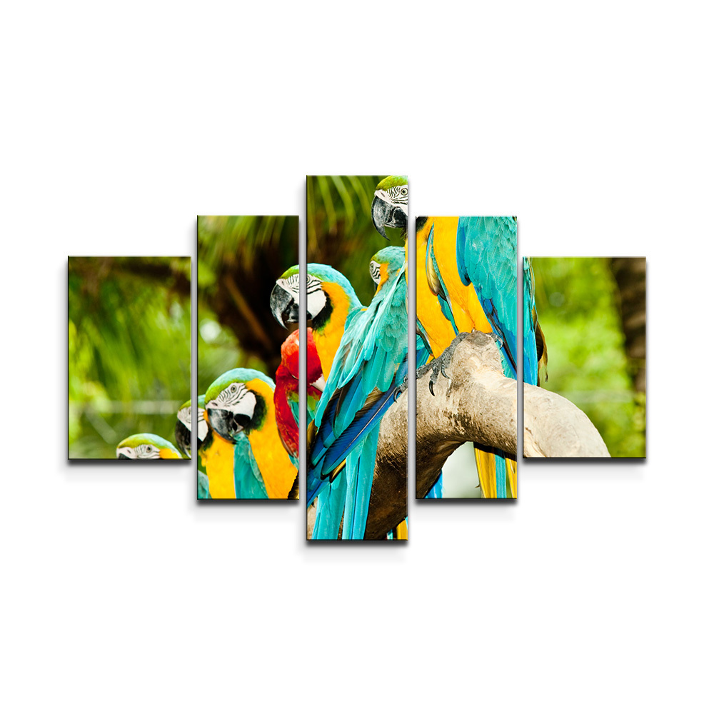 Obraz - 5-dílný Papoušci na větvi: 125x90 cm