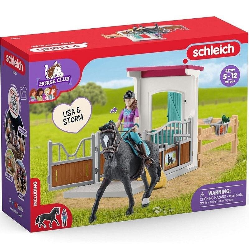 Wspaniałe, nowe figurki dziewczynek i autentyczne modele koni zapraszają do świata, gdzie wszystko krąży wokół jeździectwa. Boks dla koni z Lisa i Storm jest szczegółowo zaprojektowanym zestawem, który pozwoli dziewczynkom na kreatywną zabawę. Znajdziesz tu wszystko, by dobrze opiekować się konikiem - suchą i czystą przestrzeń, świeżą marchew do schrupania oraz wodę do picia. Czarny wałach hanowerski wraca kłusem do stajni. Właśnie zakończył trening pod kochającym okiem Lisy. Dobrze się bawili, ale teraz przyszedł czas na karmienie i wypoczynek!