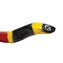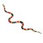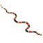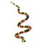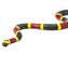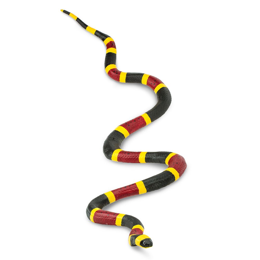 Figurka pestrobarevného jedovatého hada z kobří rodiny, který je typický svými nápadnými pruhy v červené, žluté, bílé a černé barvě.