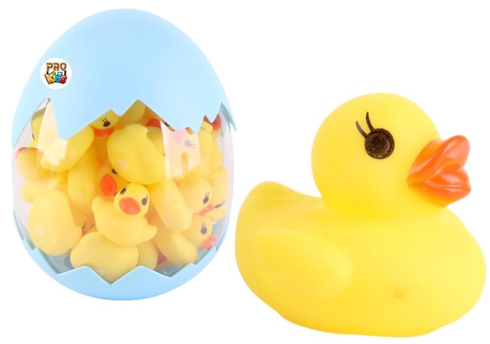 Zestaw uroczych gumowych kaczek do kąpieli w atrakcyjnym opakowaniu w kształcie jajka. Te małe, żółte kaczuszki sprawią, że każda kąpiel stanie się radosną zabawą. Miękkie i elastyczne, idealnie mieszczą się w dłoni dziecka, a po ściśnięciu wydają charakterystyczny dźwięk piszczenia. Opakowanie w formie jajka dodaje uroku i sprawia, że zestaw świetnie nadaje się na prezent.