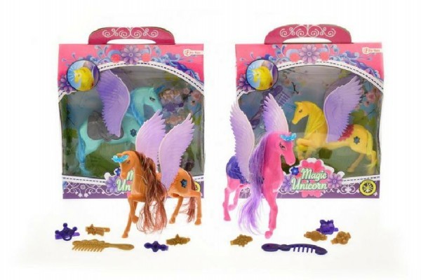 Kůň jednorožec s doplňky plast 13cm na baterie se světlem asst 4 barvy v krabici