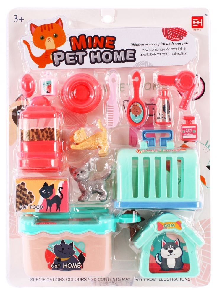 Obsah sady: transportér, 1 x pes figurka, 1 x kočičky figurka, miska pro Jídlo, domeček pro domácí mazlíčky, jídlo, doplňky pro péči o domácí zvířata. Rozměry [cm]: 21x29x8. Potřebné baterie. Hračka je určena pro děti ve věku na 3 roky. číst celé