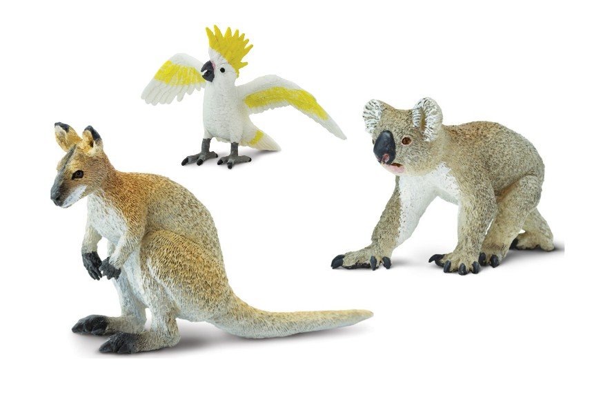 Balíček zvířat Austrálie od firmy Safari Ltd., v kterém najdete klokana, koalu a kakadu. Klokan (Wallaby) (SFS224929): 9 x 3 x 5 cm. Klokani mají dlouhou a úzkou lebku, většinou protáhlý čenich a hlavu, která vypadá drobná vzhledem k velikosti zbývajícího těla. Jejich vzrůst je střední až velký. Některé druhy dorůstají až do výšky dvou metrů. Váhy dosahují od 0,5 kg do 90 kg. Koala (SFS225329): 7.00 cm x 2.00 cm x 4.25 cm. Australská koala je tím nejroztomilejším druhem medvídků. Můžete ji nalézt v korunách stromů, kde pojídá listí eukalyptů. Kakadu žlutolící (SFS263829): 9,5 x 5 cm. Kakadu žlutolící žije v jihovýchodní Asii zejména na ostrovech Indonésie, kde žijí ve světlých lesích a na plantážích. Je zbarven většinou bíle, má pouze žlutou spodní stranu křídel a ocasu, výraznou žlutou skvrnu na líci a žlutou chocholku. Safari Ltd. Safari Ltd. je americká firma zaměřená na výrobu ekologických hraček. Na jejím počátku v roce 1982 byla dětská karetní hra na téma ohrožené druhy zvířat. V roce 1986 firma podepsala licenční smlouvu s Carnegie Museum of Natural History. Tato licence umožnila vyrábět autentické modely dinosaurů ve spolupráci s jejich nejlepšími paleontology. S postupným rozrůstáním firmy se začala rozšiřovat i série modelů, které se už neomezovaly jen na dinosaury, ale nabízely pohled na celý svět. Hlavní myšlenkou firmy Safari Ltd. je „učit se hrou“. Navrhuje figurky zvířat tak, aby byly naprosto autentické a svou kvalitou co možná nejvíce odpovídaly skutečnosti. Díky svému ručnímu zpracování je každý výrobek jedinečný. Vzhledem k stále novým vědeckým objevům jsou figurky neustále aktualizovány, mají tak pozitivní vliv na vzdělávání dítěte v oblasti přírody a její ochrany. I proto jsou velmi oblíbenou vzdělávací pomůckou pedagogů celého světa. Touto koncepcí si firma Safari Ltd. vysloužila řadu ocenění za podporu vzdělanosti a význam ochrany životního prostředí a ohrožených druhů. V současné době firma Safari Ltd. nabízí nejen samostatné modely, ale i figurky, které jsou tématicky zařazeny do sad, a to podle oblastí, kde se vyskytují, nebo podle svého živočišného druhu. Můžete se tak detailně seznámit se zvířaty Arktidy, pouště, oceánu a jiných oblastí, nebo zkoumat druhy žab, motýlů, velryb a spousty dalších. Safari Ltd. však neopomíjí ani svět lidí a jeho historii a dílo, a tak můžete poznat nejvýznamnější stavby světa, občanskou válku v Americe, idiány, pravou africkou vesnici, ale dokonce i dopravní prostředky a vesmír. Pro opravdové sběratele jsou k dispozici rozšířené sady! Samostatnou kapitolou výrobků firmy Safari Ltd. jsou produkty z kolekce Safariology. Jedná se o soubor pomůcek do přírody a modely pro pozorování života živočichů a rostlin. Tato kolekce zahrnuje dalokohledy, kompasy, krabičky na brouky, lupy a spoustu dalších nástrojů pro bádání, ale i životní cykly několika druhů zvířat a rostlin, jako je např. mořská želva, kuře, komár, včela, či fazole, ba dokonce i vývoj člověka od svého prapočátku až dodnes. Po tři generace firma Safari Ltd. pokračuje kupředu s jasnou vizí. Rok co rok vytváří stále nové hračky, které vzdělávají a ukazují našim dětem kouzla života na této planetě.