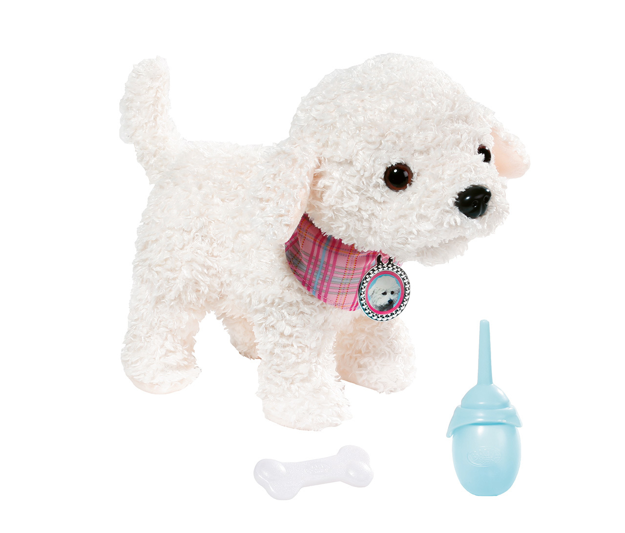 „Fuj, pejsku, fuj!“ Poté, co se tohle drzé štěňátko s kudrnatým kožíškem a barevným šátkem na krku napije ze své lahvičky, zvedne nožičku a vyčůrá se. Umí ale nejen pít vodu z lahvičky, rád také žvýká svou kostičku a vesele při tom mlaská. BABY born Čůrací štěňátko s lahvičkou a kostičkou. Čůrá po stisku tlačítka a hryže svou kostičku. Funguje na baterie, které jsou součástí balení. Je vhodné pro děti od tří let.