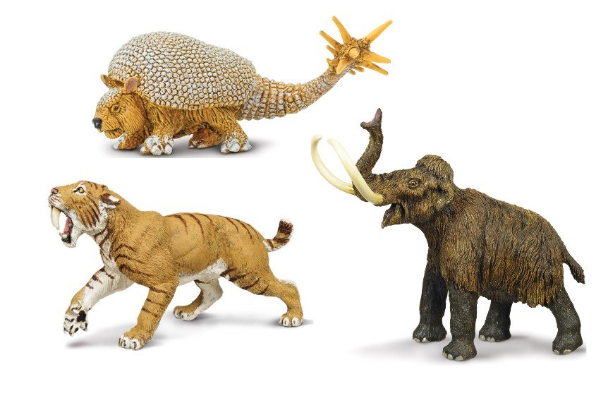 Balíček Cesta do pravěku od firmy Safari Ltd., v kterém najdete tygra, mamuta a doedicuruse. Šavlozubý tygr (SFS279729): 11,2 cm x 4,5 cm x 6,6 cm. Figurka vyhynulé kočkovité šelmy, tzv. "šavlozubých tygrů", připravena na kořist se svými drápy a otevřenou čelistí. Mamut srstnatý (SFS279929): 13 cm x 6,8 cm x 12,6 cm. Figurka ledového obra s velkými zakřivenými kly. Doedicurus (SFS283129): 10,5 x 5,75 cm. Doedicurus je vyhynulý rod pocházející z Jižní Ameriky. Svým vzhledem připomínal pásovce, byl jedním z největších prehistorických býložravců. Safari Ltd. Safari Ltd. je americká firma zaměřená na výrobu ekologických hraček. Na jejím počátku v roce 1982 byla dětská karetní hra na téma ohrožené druhy zvířat. V roce 1986 firma podepsala licenční smlouvu s Carnegie Museum of Natural History. Tato licence umožnila vyrábět autentické modely dinosaurů ve spolupráci s jejich nejlepšími paleontology. S postupným rozrůstáním firmy se začala rozšiřovat i série modelů, které se už neomezovaly jen na dinosaury, ale nabízely pohled na celý svět. Hlavní myšlenkou firmy Safari Ltd. je „učit se hrou“. Navrhuje figurky zvířat tak, aby byly naprosto autentické a svou kvalitou co možná nejvíce odpovídaly skutečnosti. Díky svému ručnímu zpracování je každý výrobek jedinečný. Vzhledem k stále novým vědeckým objevům jsou figurky neustále aktualizovány, mají tak pozitivní vliv na vzdělávání dítěte v oblasti přírody a její ochrany. I proto jsou velmi oblíbenou vzdělávací pomůckou pedagogů celého světa. Touto koncepcí si firma Safari Ltd. vysloužila řadu ocenění za podporu vzdělanosti a význam ochrany životního prostředí a ohrožených druhů. V současné době firma Safari Ltd. nabízí nejen samostatné modely, ale i figurky, které jsou tématicky zařazeny do sad, a to podle oblastí, kde se vyskytují, nebo podle svého živočišného druhu. Můžete se tak detailně seznámit se zvířaty Arktidy, pouště, oceánu a jiných oblastí, nebo zkoumat druhy žab, motýlů, velryb a spousty dalších. Safari Ltd. však neopomíjí ani svět lidí a jeho historii a dílo, a tak můžete poznat nejvýznamnější stavby světa, občanskou válku v Americe, idiány, pravou africkou vesnici, ale dokonce i dopravní prostředky a vesmír. Pro opravdové sběratele jsou k dispozici rozšířené sady! Samostatnou kapitolou výrobků firmy Safari Ltd. jsou produkty z kolekce Safariology. Jedná se o soubor pomůcek do přírody a modely pro pozorování života živočichů a rostlin. Tato kolekce zahrnuje dalokohledy, kompasy, krabičky na brouky, lupy a spoustu dalších nástrojů pro bádání, ale i životní cykly několika druhů zvířat a rostlin, jako je např. mořská želva, kuře, komár, včela, či fazole, ba dokonce i vývoj člověka od svého prapočátku až dodnes. Po tři generace firma Safari Ltd. pokračuje kupředu s jasnou vizí. Rok co rok vytváří stále nové hračky, které vzdělávají a ukazují našim dětem kouzla života na této planetě.