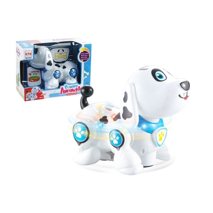 Pejsek na baterie. Po zapnutí se začne pejsek pohybovat různými směry a při nárazu o překážku změní směr. Přitom svítí, vydává reálné zvuky pejska a hraje melodii. Hračka vyžaduje 3ks 1,5V baterií typu AA, které nejsou součástí balení. Nevhodné pro děti do 3 let.Rozměr pejska - 20 x 15,5cm