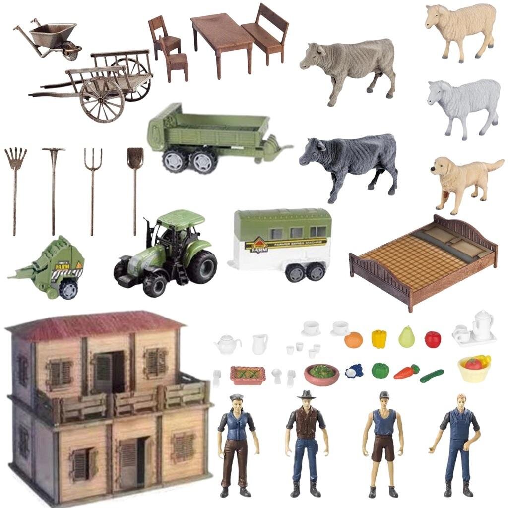 Figurki różnych zwierząt można karmić, zabawiać i troszczyć się o nie na swojej farmie. Ponadto w zestawie znajdują się meble do domku rolnika, takie jak łóżko, krzesła, ławka i stół, a także akcesoria kuchenne.