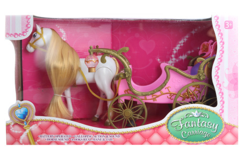 Koník s růžovým kočárem. Po vložení baterií koník chodí a hraje. Napájení na 3 AA baterie (nejsou součástí balení). Rozměry balení cca 50 x 28 x 19 cm. Věk 3+