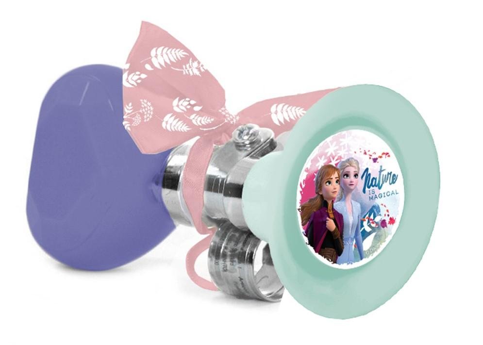 Klakson na kolo s motivem Frozen.Připevnění na řidítka.Materiál: kov - plast.Rozměr: 14 x 6,5 cm.Barva: fialovo - tyrkysová.Pro děti od 3 let.Výrobce: Seven.